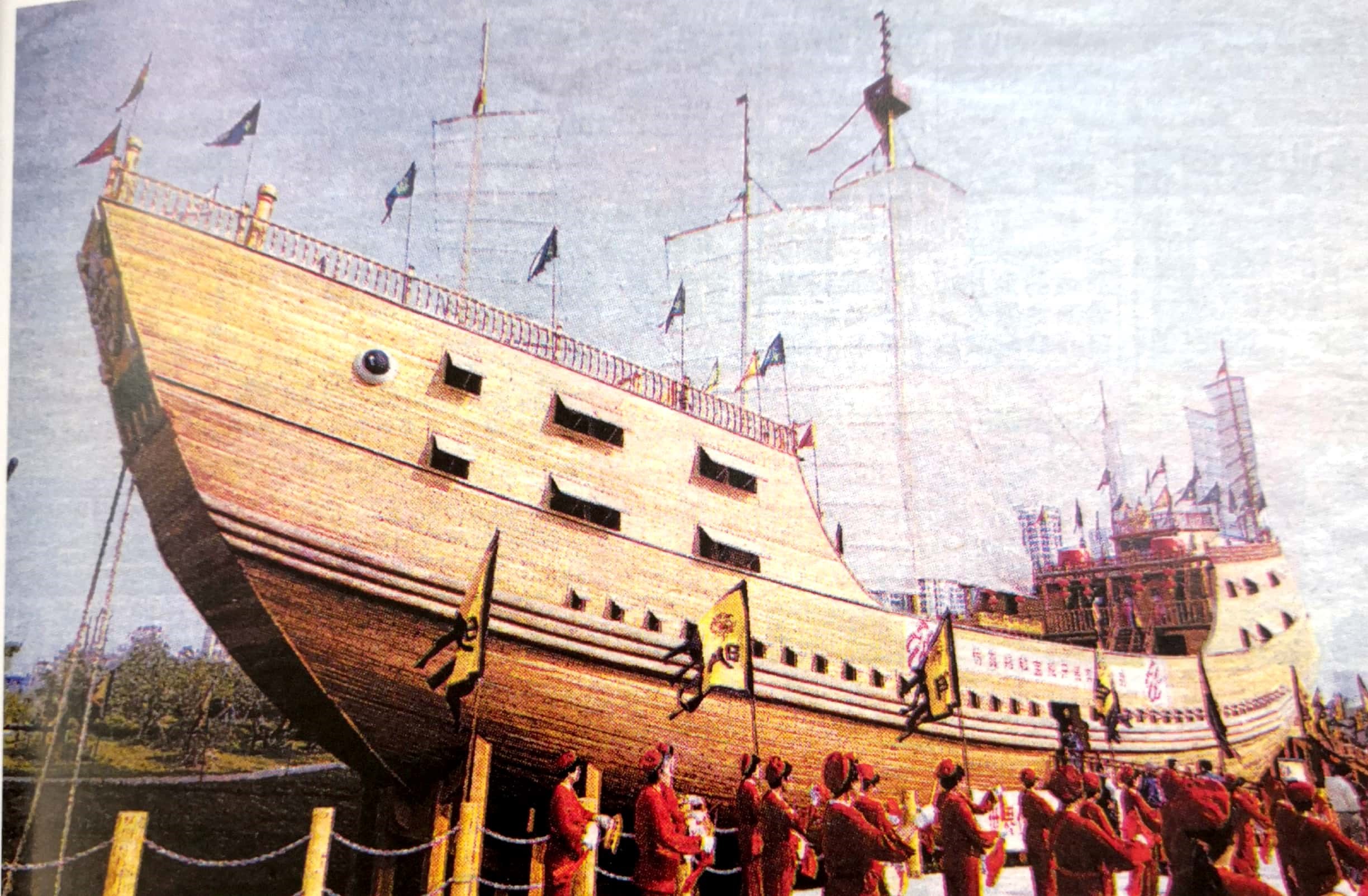 (此图展示郑和宝船的复原模型,突出其多层结构和巨大尺度,与欧洲同时期船只形成鲜明对比。)