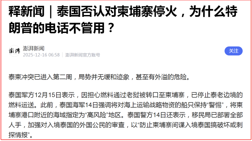双方刚打起来,就有很多劝架的。泰国方面态度很坚决,谁劝架也不好使,包括特朗普。特朗普甚至威胁,你要是不听话,我就加征关税。泰国说:加税也不行,你不能只在我占上风的时候拉架。