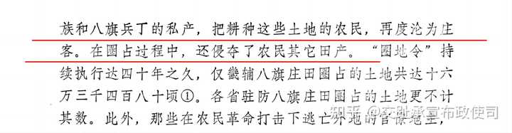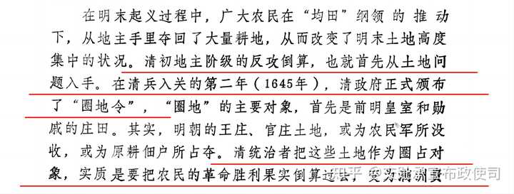 在明末起义过程中,广大农民在「均田」纲领的推动下,从地主手里夺回了大量耕地,从而改变了明末土地高度集中的状况。清初地主阶级的反攻倒算,也就首先从土地问题入手。在清兵入关的第二年(1645年),清政府正式颁布了「圈地令」,「圈地」的主要对象,首先是前明皇室和勋戚的庄田。其实,明朝的王庄、官庄土地,或为农民军所没收,或为原耕佃户所占夺。清统治者把这些土地作为圈占对象,实质是要把农民的革命胜利果实倒算过去,变为满洲贵族和八旗兵丁的私产,把耕种这些土地的农民,再度沦为庄客。在圈占过程中,还侵夺了农民其它田产。「圈地令」持续执行达四十年之久,仅畿辅八旗庄田圈占的土地共达十六万三千四百八十顷。各省驻防八旗庄田圈占的土地更不计其数。