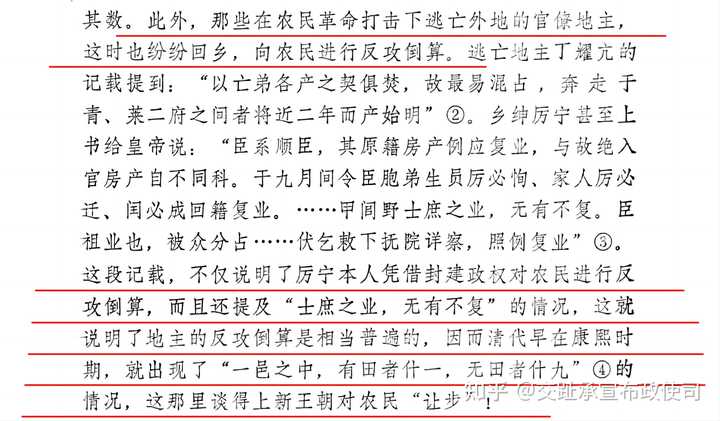 此外,那些在农民革命打击下逃亡外地的官僚地主,这时也纷纷回乡,向农民进行反攻倒算。逃亡地主丁耀亢的记载提到:「以亡弟各产之契俱焚,故最易混占,奔走于青、莱二府之间者将近二年而产始明」。乡绅历宁甚至上书给皇帝说:「臣系顺臣,其原籍房产例应复业,与故绝入官房产自不同科。于九月间令臣胞弟生员历必恂、家人厉必迁、闰必成回籍复业。……甲间野士庶之业,无有不复。臣祖业也,被众分占……伏乞敕下抚院详察,照例复业」。这段记载,不仅说明了厉宁本人凭借封建政权对农民进行反攻倒算,而且还提及「士庶之业,无有不复」的情况,这就说明了地主的反攻倒算是相当普遍的,因而清代早在康熙时期,就出现了「一邑之中,有田者什一,无田者什九」的情况,这那里谈得上新王朝对农民「让步」!