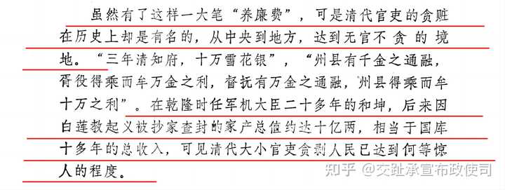 虽然有了这样一大笔「养廉费」,可是清代官吏的贪赃在历史上却是有名的,从中央到地方,达到无官不贪的境地。三年清知府,十万雪花银」,州县有千金之通融,胥役得乘而牟万金之利,督抚有万金之通融,州县得乘而牟十万之利」。在乾隆时任军机大臣二十多年的和坤,后来因白莲教起义被抄家查封的家产总值约达十亿两,相当于国库十多年的总收入,可见清代大小官吏贪剥人民已达到何等惊人的程度。