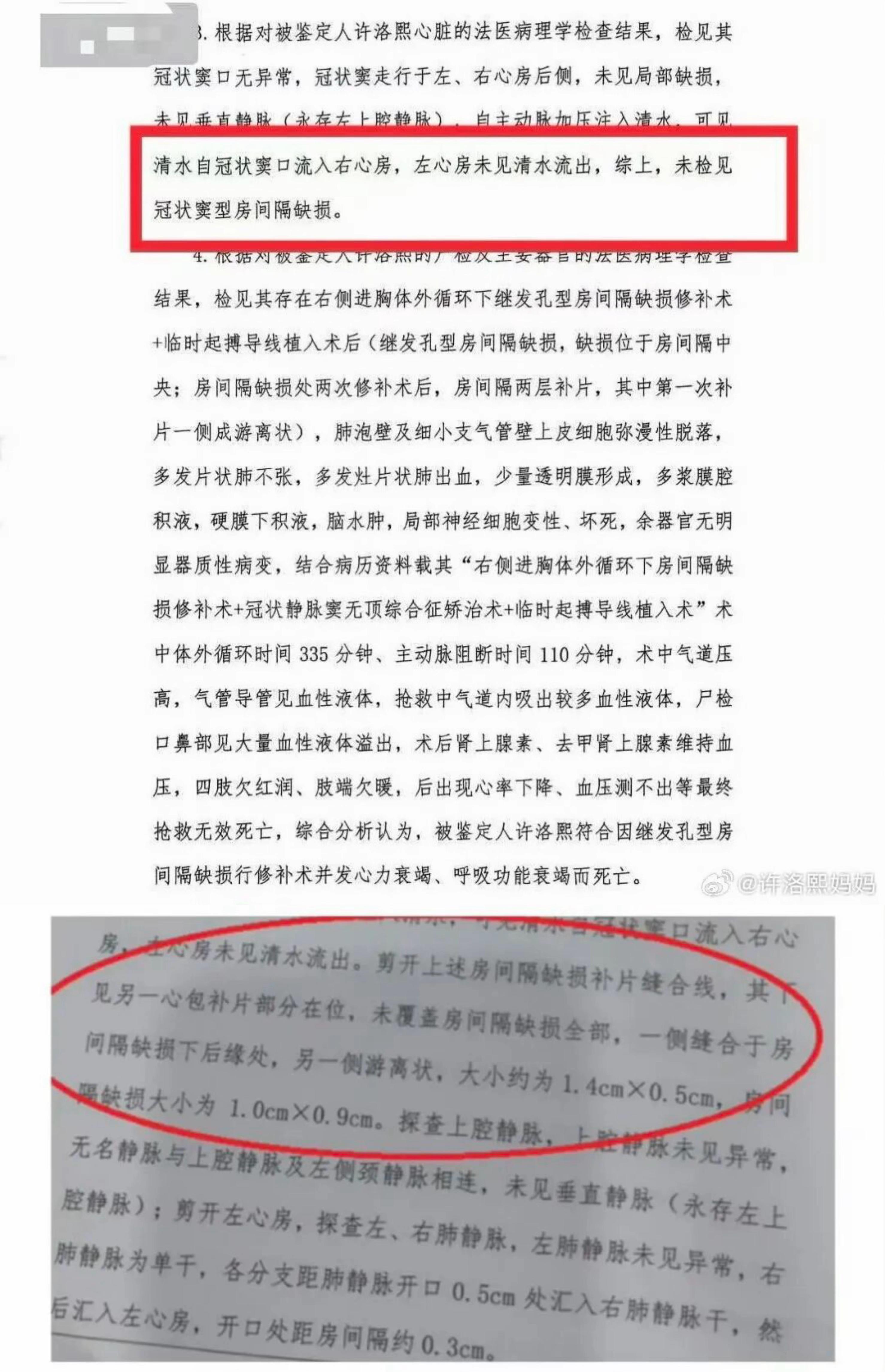 12月20日,洛熙妈妈发出了尸检报告截图,刘良法医团队确认「未检见冠状窦型房间隔缺损」,「房间隔缺损大小为1.0cmx0.9cm」,「许洛熙符合因继发孔型房间隔缺损行修补术并发心力衰竭、呼吸衰竭而死亡」。