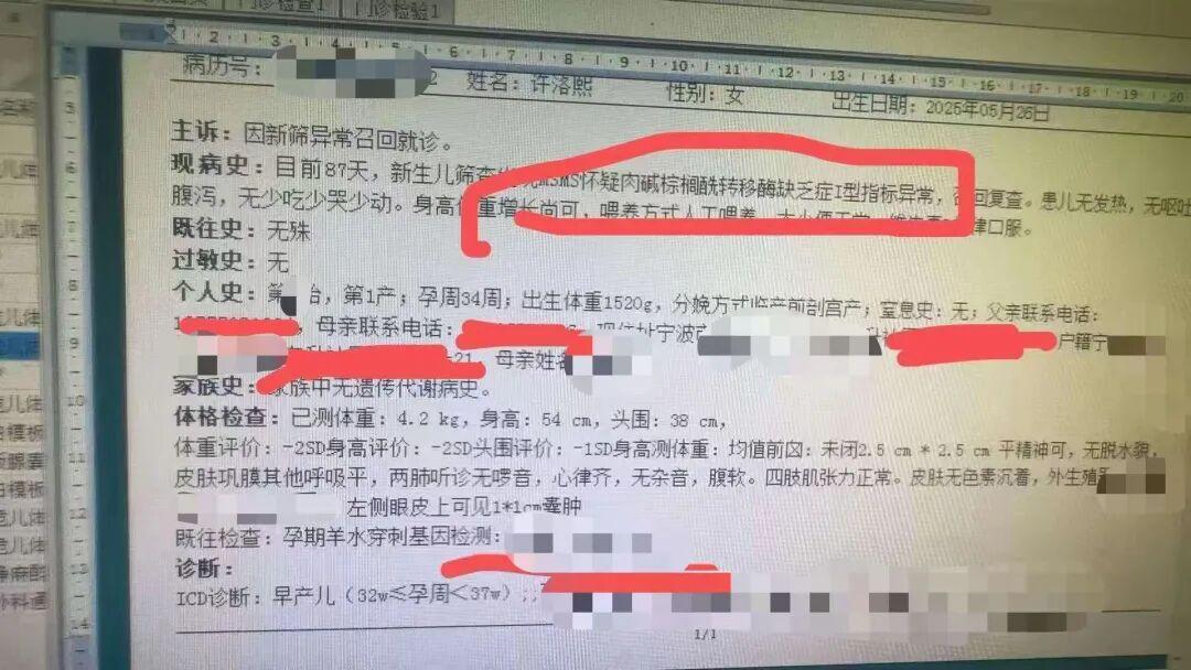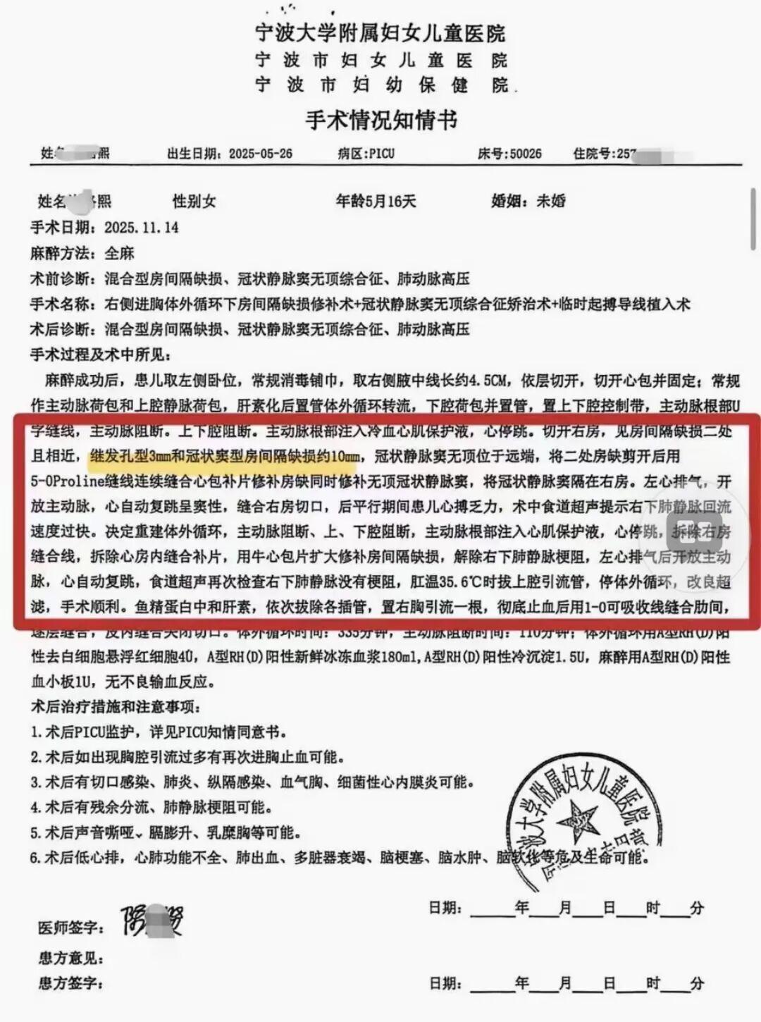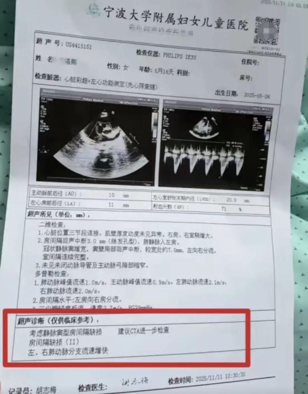 2025年11月11日,洛熙父母带洛熙到宁波妇儿医院做例行儿保检查,b超结果显示洛熙存在3mm继发孔型房缺,考虑存在7mm冠状窦型房缺,建议进一步检查。洛熙父母说,主任医师陈君贤建议立即手术,说手术成功率高、风险低,不立即做手术危害极大,当天安排洛熙住院,进行各项检查,准备11月14日手术。注意,这部分对话很可能没有保留证据。