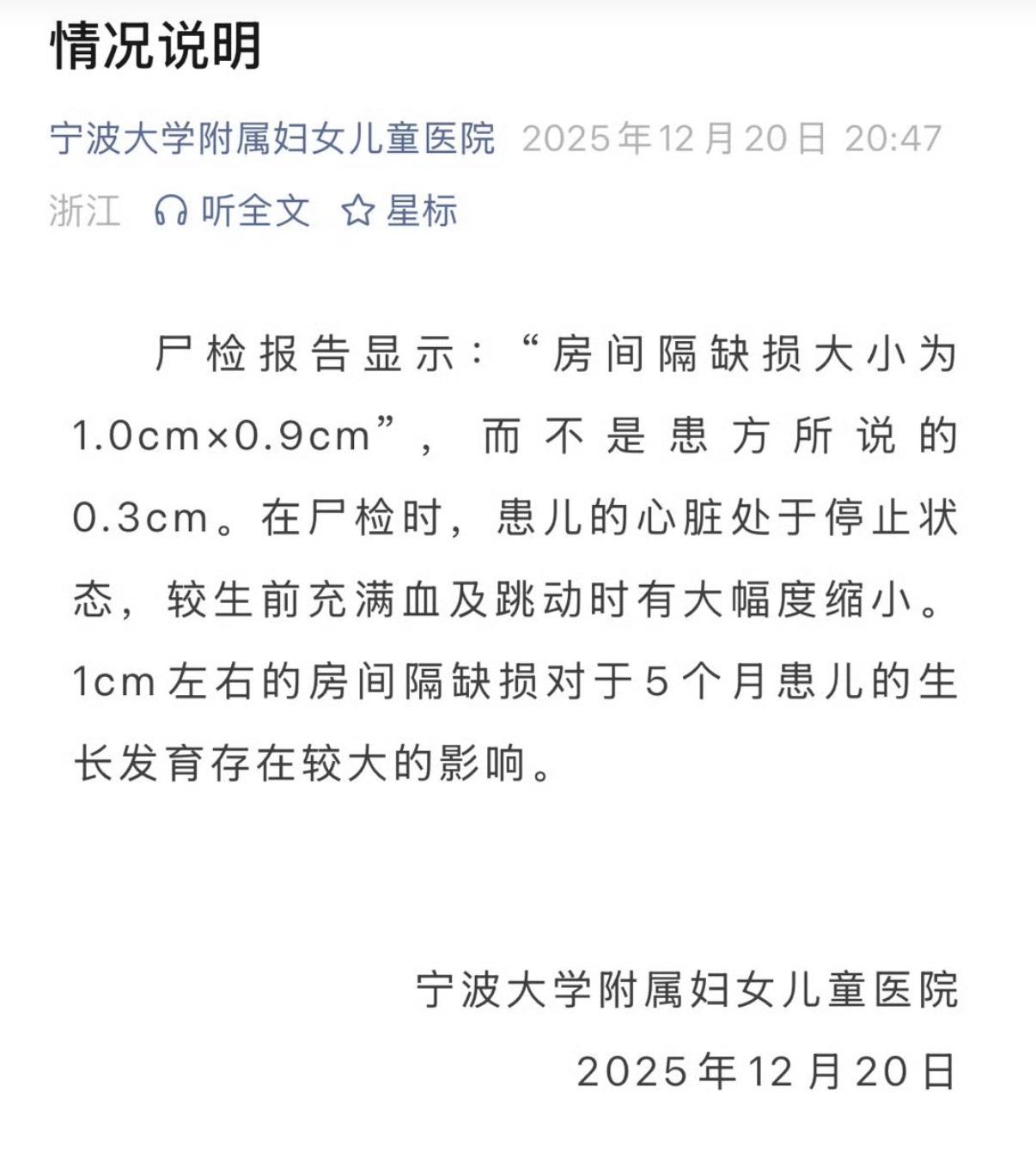 院方晚上20时47分发了一个情况说明,但很快删除了,内容如下:尸检报告显示房间隔缺损大小为1.0cmx0.9cm,而不是患方所说的0.3cm。在尸检时,患儿的心脏处于停止状态,较生前充满血及跳动时有大幅度缩小。1cm左右的房间隔缺损对于5个月患儿的生长发育存在较大的影响。