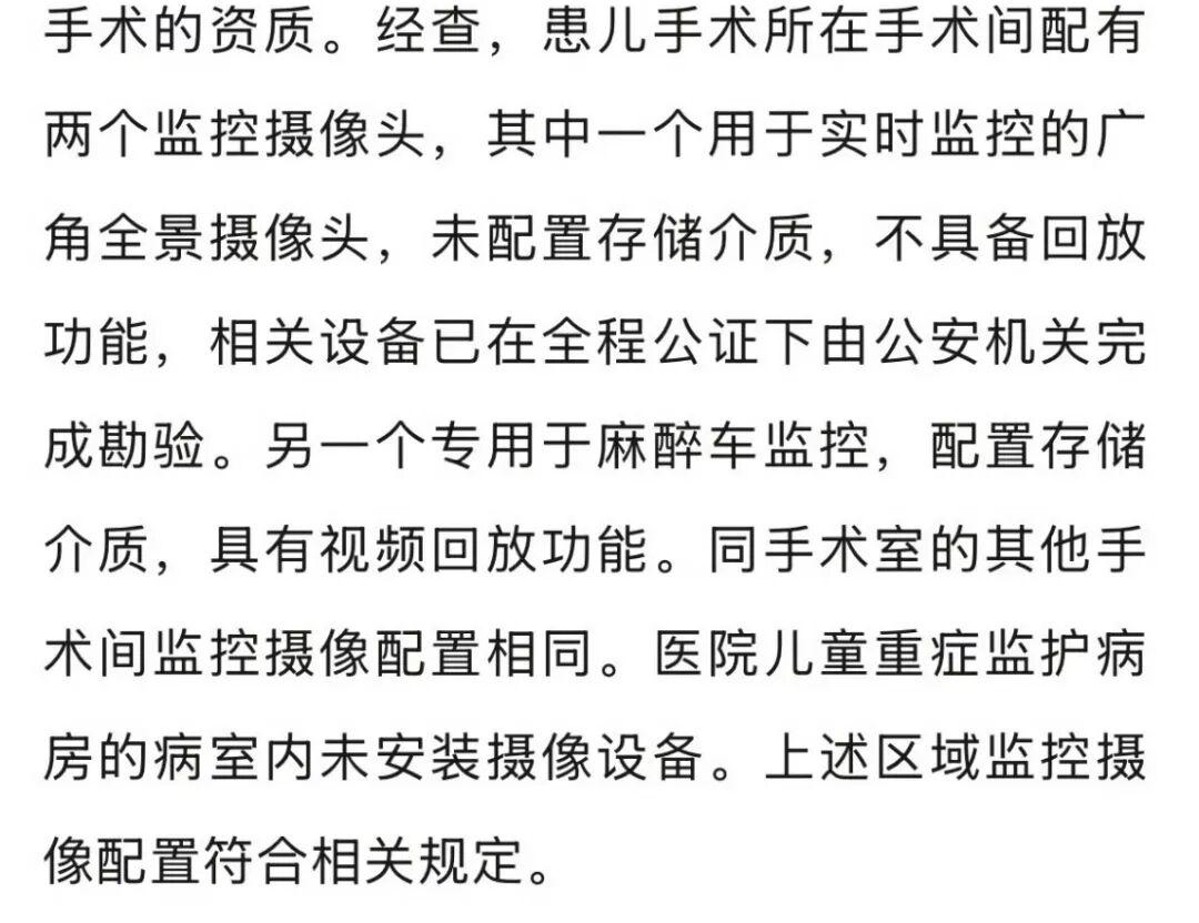 12月14日,宁波卫健委出具情况通报,确认院方对手术风险评估不足、手术操作存在过失、术中出现突发情况未及时告知、术后监护处置有缺陷,处分了一批人,并说明手术室监控设备没有存储回放功能、儿童重症监护室没有监控设备不违规。
