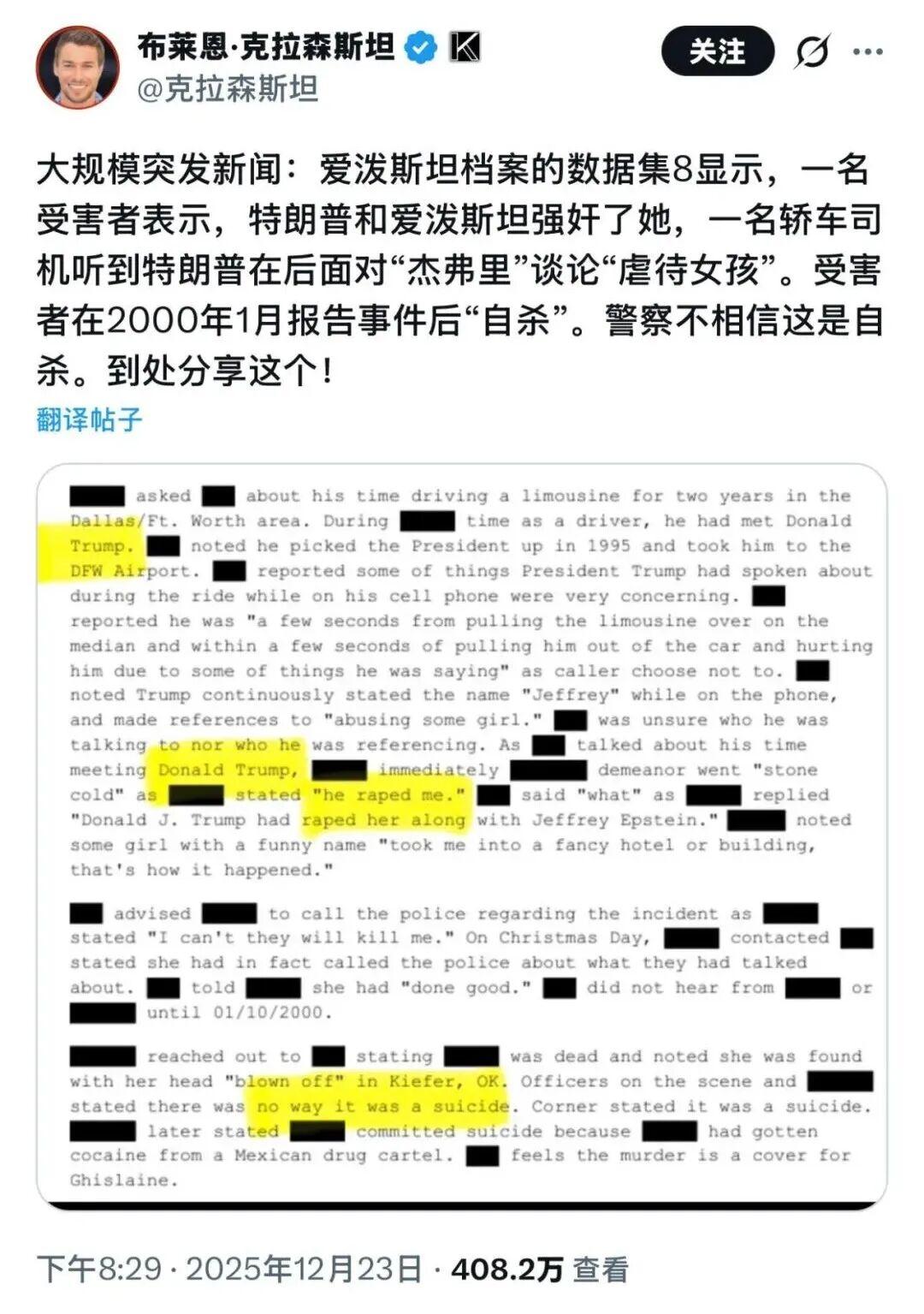 本来大家对自杀论半信半疑,现在官方亲自下场造假,那基本可以认定,爱泼斯坦是被灭口了。只有死人,才能守住最核心的秘密。