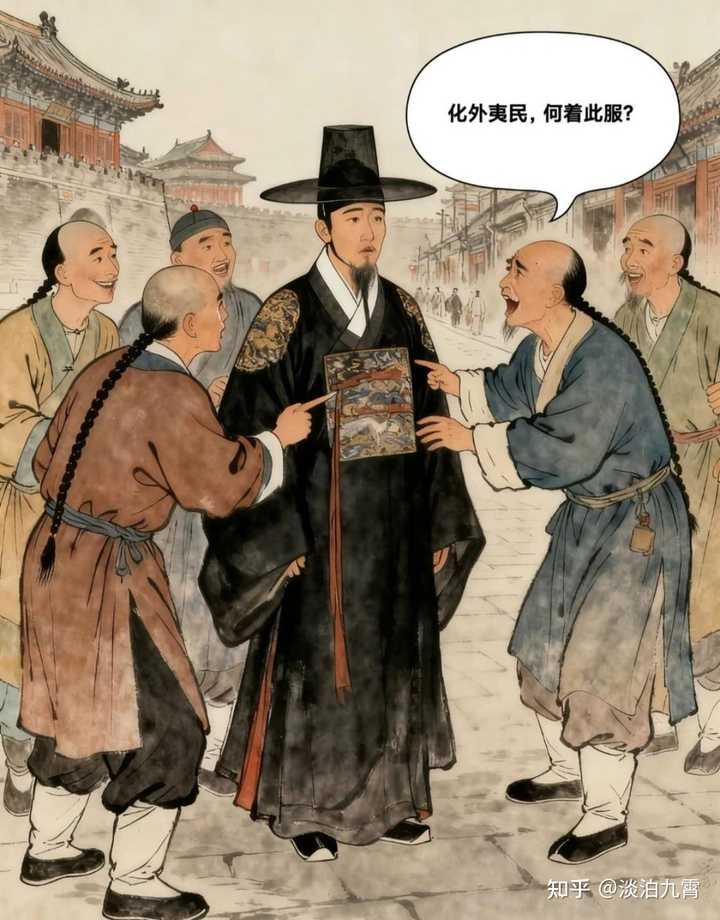 道光二年,朝鲜使团再次来到中国,穿的还是明朝服饰,汉人穿旗服已经成了共识,梳着丑陋的鼠尾辫反而成了自豪,他们盯着朝鲜使团身上的服饰嘲笑道,「岛国蛮夷,异服不堪入目也。」