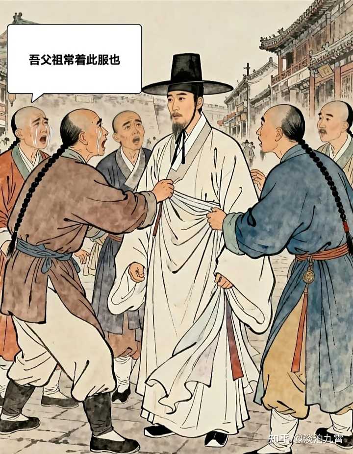 满清入关后,朝鲜第一次来朝拜顺治皇帝,穿的还是明朝官服,中国的汉人百姓却穿着满清的旗服,顶着金钱鼠尾辫,他们摸着朝鲜使团身上的衣服,再看看自己丑陋的造型,大哭不止,「我父祖曾常着此衣冠耶!」