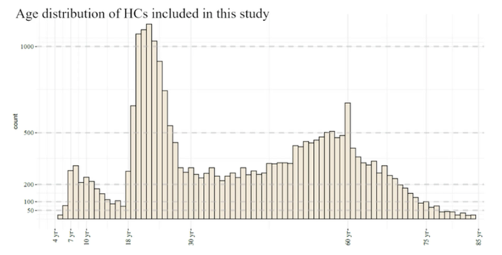 这张图展示的是本研究用于建立中国人群脑结构常模的健康对照(HC)样本年龄分布,总计纳入 24,061 名健康个体。横轴为年龄、纵轴为样本数量,整体覆盖 4–85 岁。