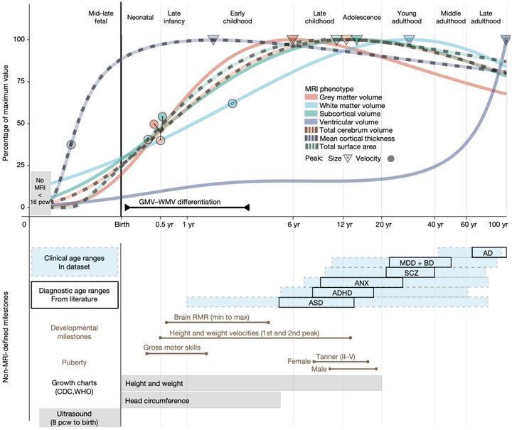 这个图,来自于自 2022 年发表于《Nature》的一项里程碑式研究,由英国剑桥大学、美国宾夕法尼亚大学等多机构合作完成。研究整合了全球上百个独立影像队列,覆盖从胎儿中晚期、新生儿、儿童、青春期到百岁老年的全生命周期,通过统一建模构建了人类脑结构随年龄变化的「参考曲线」。图中用同一坐标系同时展示了灰质体积、白质体积、皮层厚度、皮层表面积、脑室体积等关键脑结构指标,并将这些变化与非影像学的生物学里程碑以及常见精神神经疾病的典型发病年龄窗口进行对照。