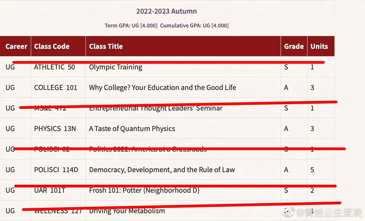 另外,你说拿着推荐信上大学的人,大学能让他们毕不了业吗?就像体育特招生那样,可以选择Pass or no Pass,谷爱凌的第一学期成绩单全都是这样的,搞得谷爱凌都不敢晒成绩单了,那玩意一晒出来就知道含金量多少,有几个有学分的?