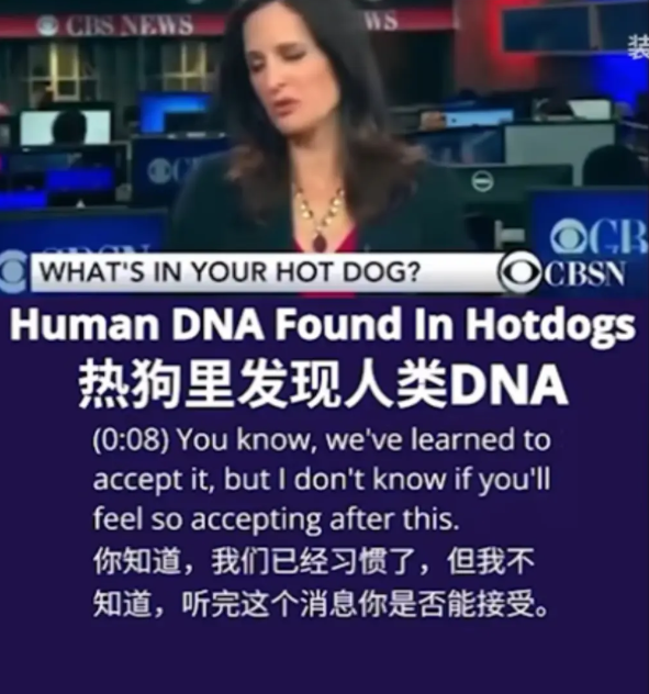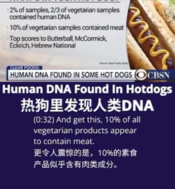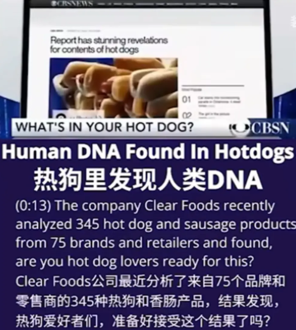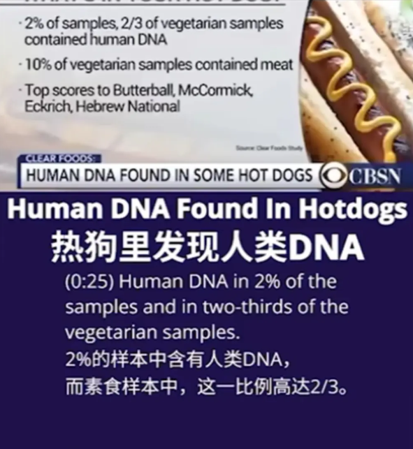 CBSN报道的Clear Foods公司分析了75个品牌和零售商的345种热狗产品,有2%的样本中含有人类DNA,而素食样本中这一比例高达2/3
