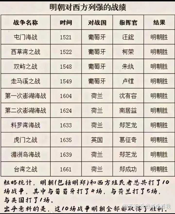 明朝(包括明郑)汉人与当时的西方「海上马车夫」们打了10场战争,其中与葡萄牙打了4场,与荷兰打了5场,与英国打了1场,这10场中外战争明朝汉人全部都取得了胜利。