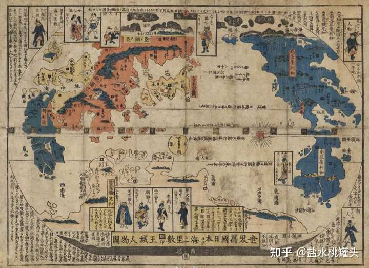 即便在 200 年后的 1853 年,日本绘制的《世界万国日本海上里属王城人物图》中,日本依然被夸张地画得比我国和欧洲更大。