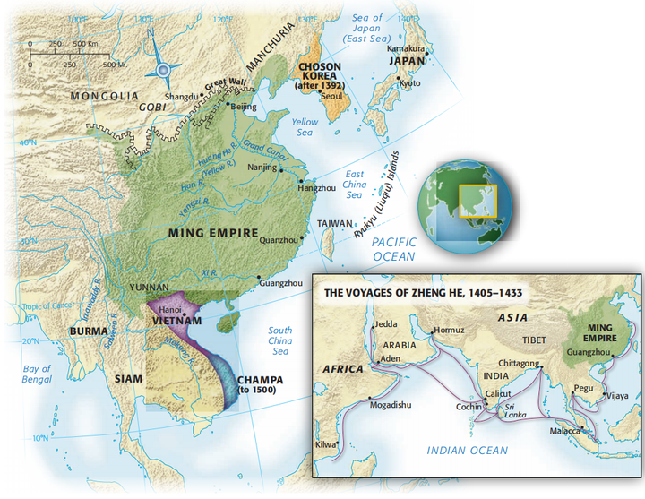印度洋商人大多不受其所服务的帝国和国家的控制,但在东亚,中华帝国统治者对这些富饶的贸易港口越来越感兴趣。1368年,明朝推翻了蒙古统治,开始重建中国在海外的统治地位和威望。明朝恢复了中国在东亚的实力和影响力后,开始与印度洋周边民族建立直接联系,通过征服将其权力扩展到越南,并在1405年至1433年间派出七支皇家舰队。这些远航的规模之大,远远超出了单纯的探险或贸易所需。尽管明朝力图彰显其国力与成就,但仍有三次动用武力达成目标,其中包括击败并俘虏锡兰(今斯里兰卡)国王。虽然对这片富饶地区的好奇心或许是这些远征的动机之一,但舰队所到访的港口均为重要的商业中心,其中一些港口早已与中国建立了贸易关系。
