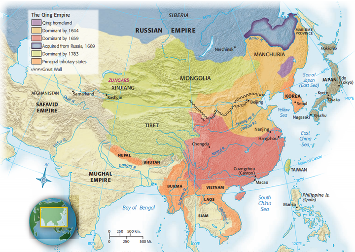 明朝早期(见第13章)的经济和文化成就延续到了16世纪。但这一繁荣时期之后,中国经历了数十年的政治衰弱、战争和农村困境,直到来自满洲的清朝建立,才带领中国重回和平与繁荣。