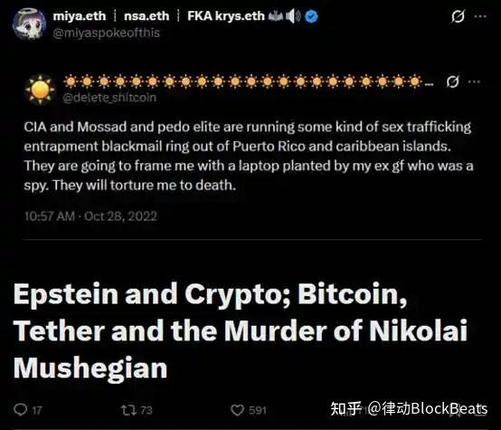 这张图来自社区用户@miyaspokeofthis的文章,将Nikolai Mushegian(MakerDAO联合创始人)的离奇死亡、爱泼斯坦、Tether早期人物Brock Pierce以及「比特币被劫持论」串联起来,形成了一张令人不安的关系网。