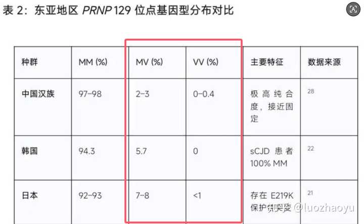 而在东亚这边则极少有人携带能抵抗朊病毒的基因,中国汉族(MV+VV型)的基因率仅有3%,韩国人约6%,日本人约7~8%。