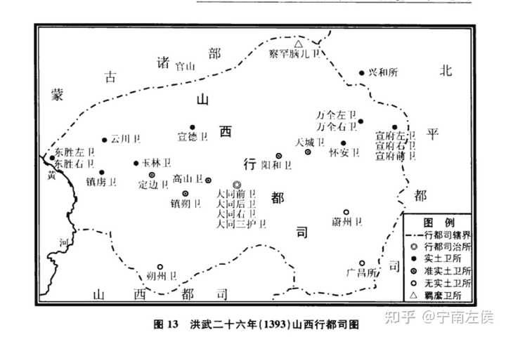 比如明初晋北山西行都司东胜、镇虏、云川、玉林四卫的位置: