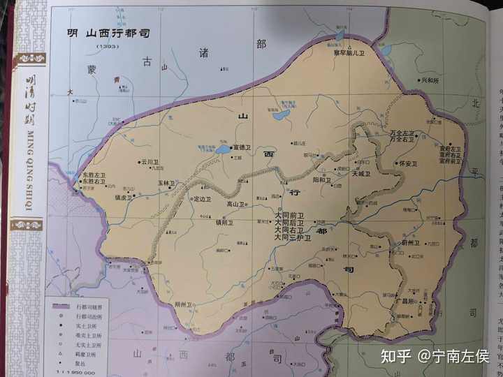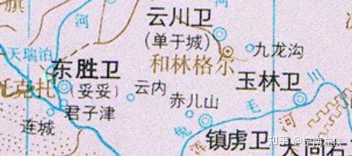 其实纠错也很简单,谭图上东胜、玉林是没错的,镇虏卫需要往西挪到标注云内的那个位置,然后把云川往下挪到镇虏卫的位置就可以了,不过遗憾的是,这本文物地图在前边的内蒙古历史行政区划沿革那里并没有绘制明朝时期,所以就没有一个正确的图把这四个卫的位置标注出来,因此近几十年大家就一遍一遍重复位置错误的图,虽然文章考证是对的。