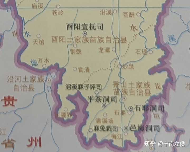 但饶是这种地方编绘的,也不可全信,因为也有不足和讹误,就像 《重庆历史地图集》 明代这张图,重庆东南的石砫宣抚司括注了 「属重庆卫」,但同样属于重庆卫的酉阳宣抚司却没有括注,而且酉阳南边的几个长官司也有问题,溶溪芝麻子坪长官司和平茶洞长官司是直属于四川布政司的,因此这俩虽然级别低而且规模小,却是需要单独标注并绘出界线的,界线还得是府界,但 《重庆历史地图集》 在处理这里时,却将其简单标注成了重庆府境内的地名,这就属于问题,而最大的问题则是,「溶溪芝麻子坪长官司」 的 「芝」 字丢了,写成了 「溶溪麻子坪」: