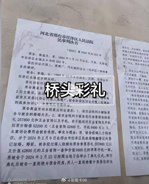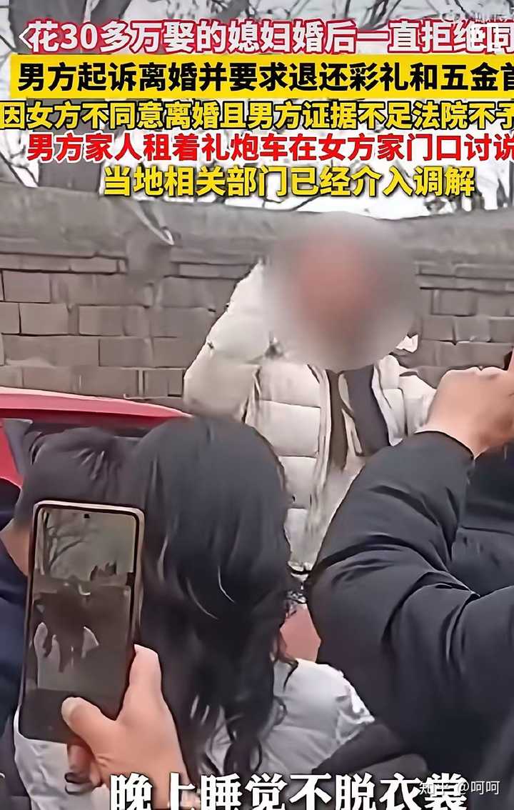 昨天在河北省邢台市任县桥头村发生了一件事:男方系退伍军人,经媒人介绍与李女士相识结婚,彩礼加五金等总共花了 30 多万。结果婚后妻子长期拒绝同房,不在男方家居住,10 个月后男方起诉离婚并要求退彩礼。