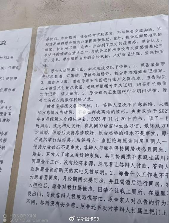 女方答辩称:不同意离婚,两人 「感情并未破裂」,但又说自己经常遭到家暴、被强迫同房,导致抑郁症。